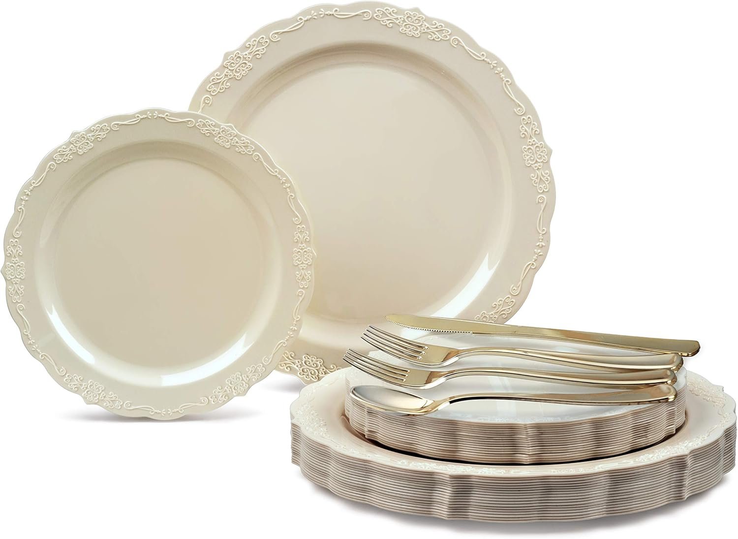Perfect for a wide array of occasions, this tableware set shines in settings where presentation matters. Use the 10-inch dinner plates for family-style servings at weddings or corporate dinners, and the 7.5-inch plates for passed hors d’oeuvres at bridal showers. The gold silverware adds a touch of glamour to anniversaries, birthdays, graduation celebrations, baby showers, engagement parties, bachelorette bashes, family reunions, and holiday festivities. It’s also suitable for large-scale events like galas or themed parties, where the vintage ivory design complements floral centerpieces and ambient lighting. For businesses in catering, event planning, or hospitality, this set streamlines operations while impressing clients and attendees alike.